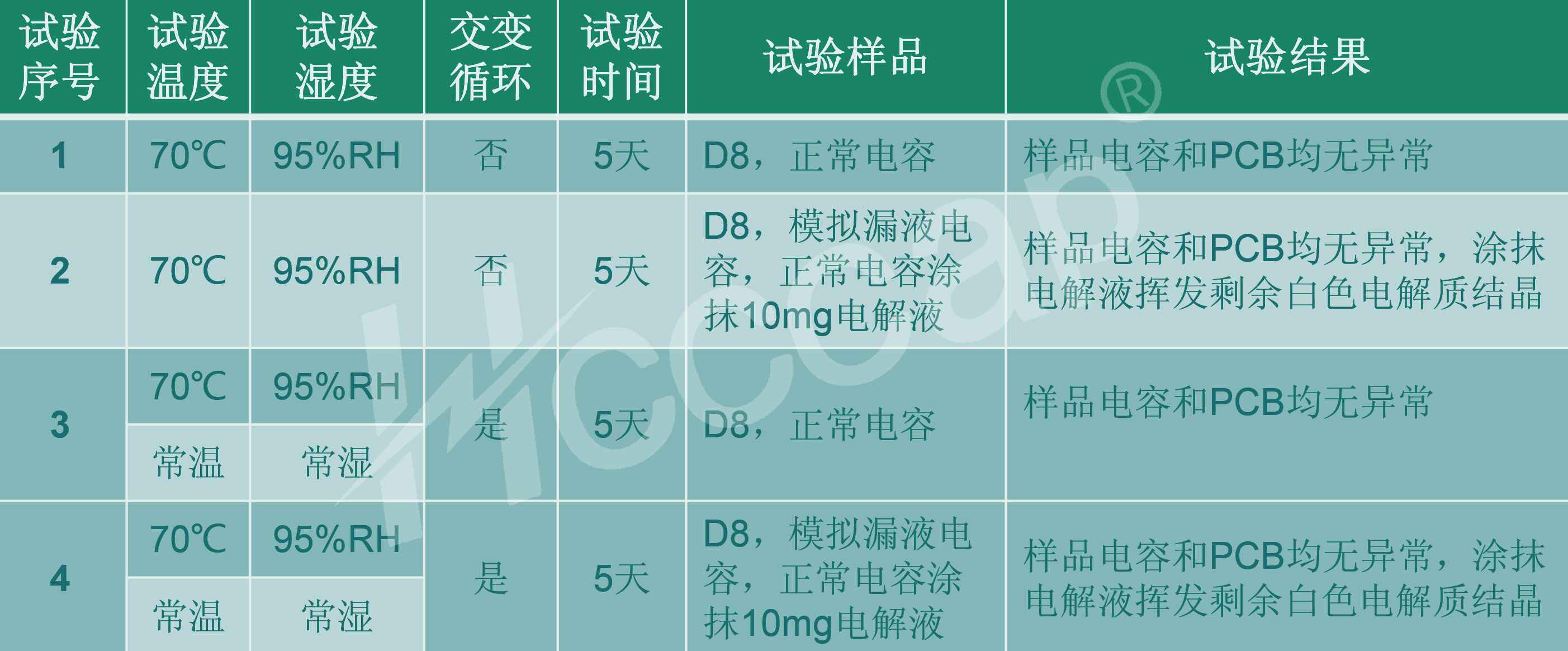 2.无论正常超级电容,还是模拟”漏液“电容,持续高温高湿(70℃, 95%RH)与常温常湿交变循环短时不会导致电容本身特性或者关联 PCB出现异常;